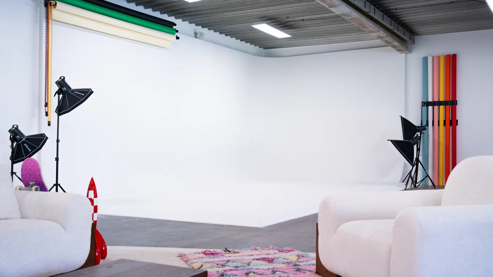 Le studio est disponible à la demi-journée, à la journée ou en session horaire, et s’adapte à tout type de projet : mode, portrait, clip, produit, corporate, contenu digital ou artistique. Du matériel photo et vidéo est également disponible à la location sur place.